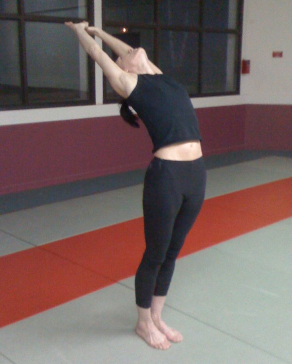 Redressez vous  en déroulant le dos et en ramenant rapidement les mains jointes en prière sur la poitrine pour aussitôt les levez avec les bras vers le ciel et en arrière.
